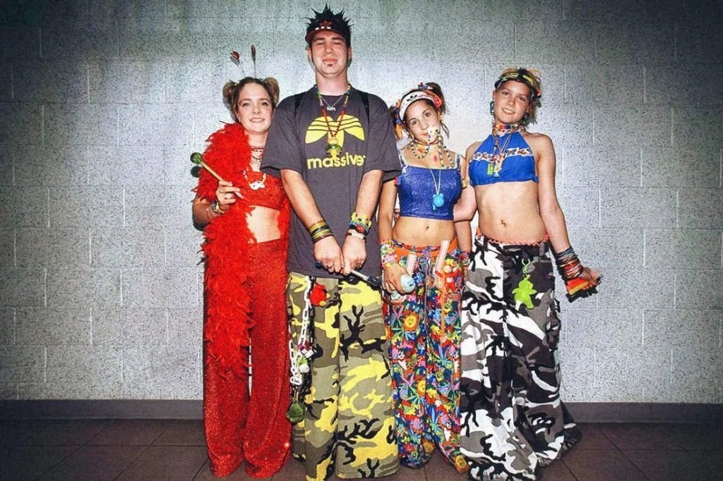 Rave culture expressed its fashion less seriously, intending to take life less seriously and more freely. It allowed its wearers to embrace bright and neon colors that most other scenes found childish and ugly. But the culture felt welcoming for any self-expression, in which the trend seemed to be attempting to push the color palette to the extreme. It has changed over time, but has seen the colors and freedom stay consistent from the beginning to today. This movement, which paired a similar rise to that of hip hop, saw an early, strong embracing of street wear, but with a far different pattern, opting for off-brand goods, wild patterns, and just seeking as much color as possible.